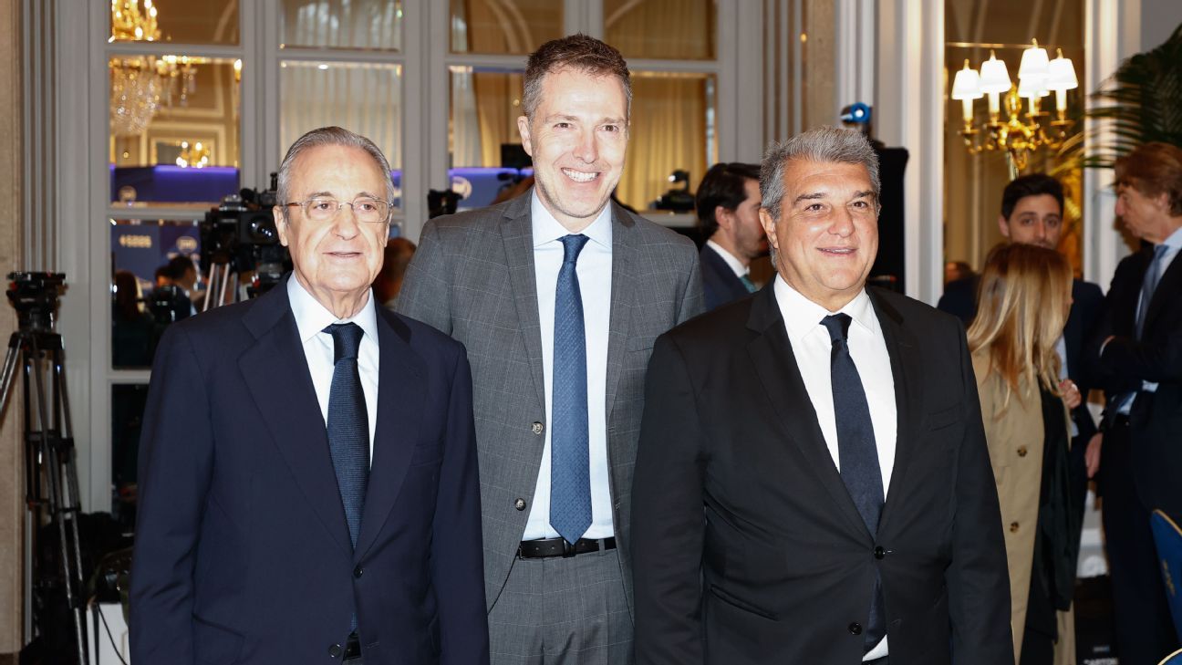Standing with Bernd Reichart, Real Madrid’s Florentino Perez and Barcelona’s Joan Laporta have already supported the new plans. Oscar J. Barroso/Europa Press via Getty Images