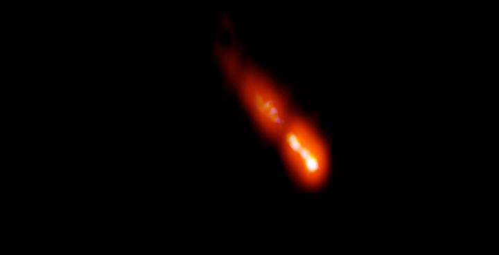 In this picture, the brightest radio emission comes from the core of the galaxy in the lower right. The beam is driven by the gravitational energy of a supermassive black hole in the core and moves outward to the top left. The jet shown here spans around 1,600 light years and shows structure in it.