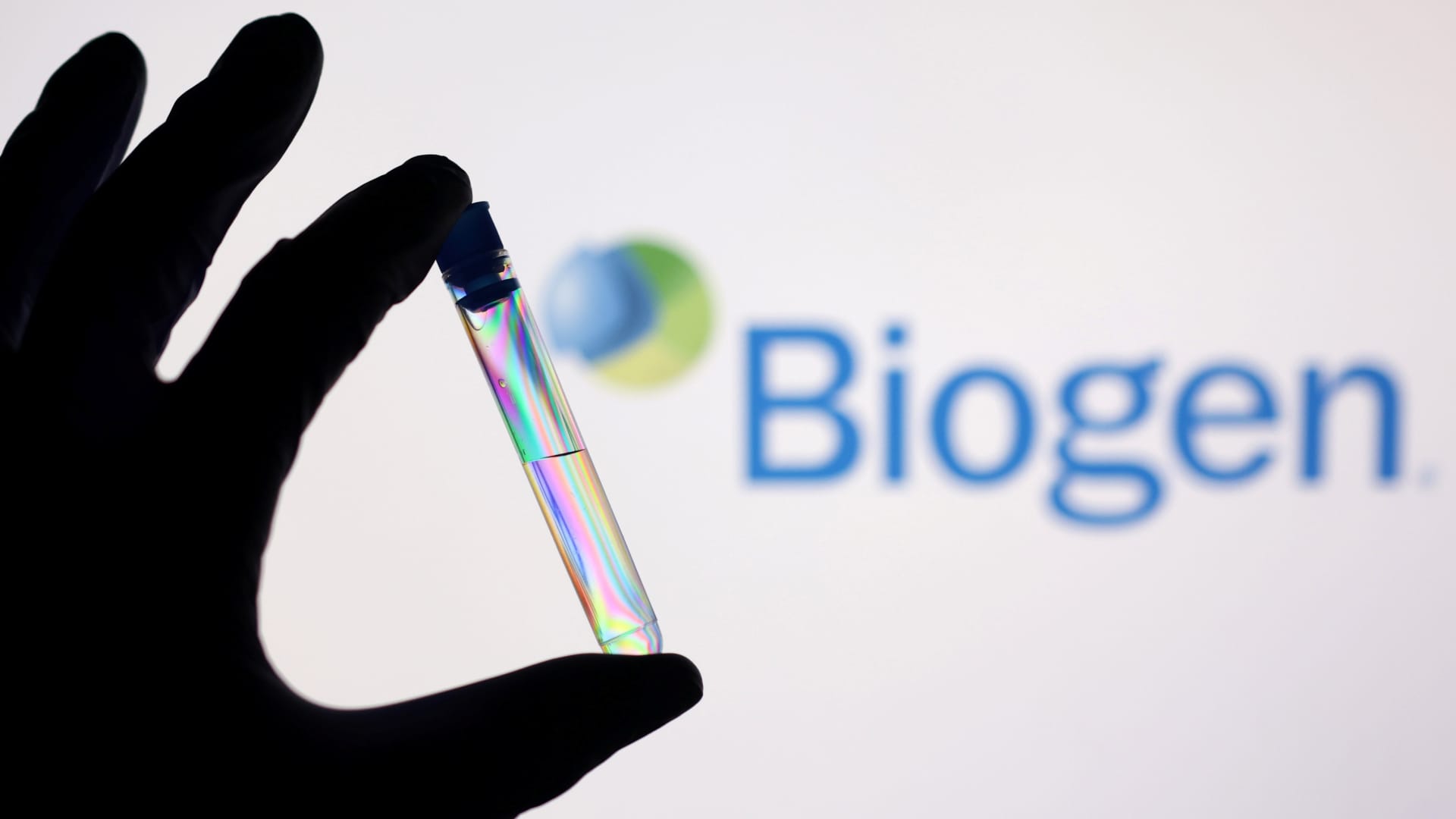 In this image from December 1, 2021, a test tube can be seen in front of the Biogen logo.