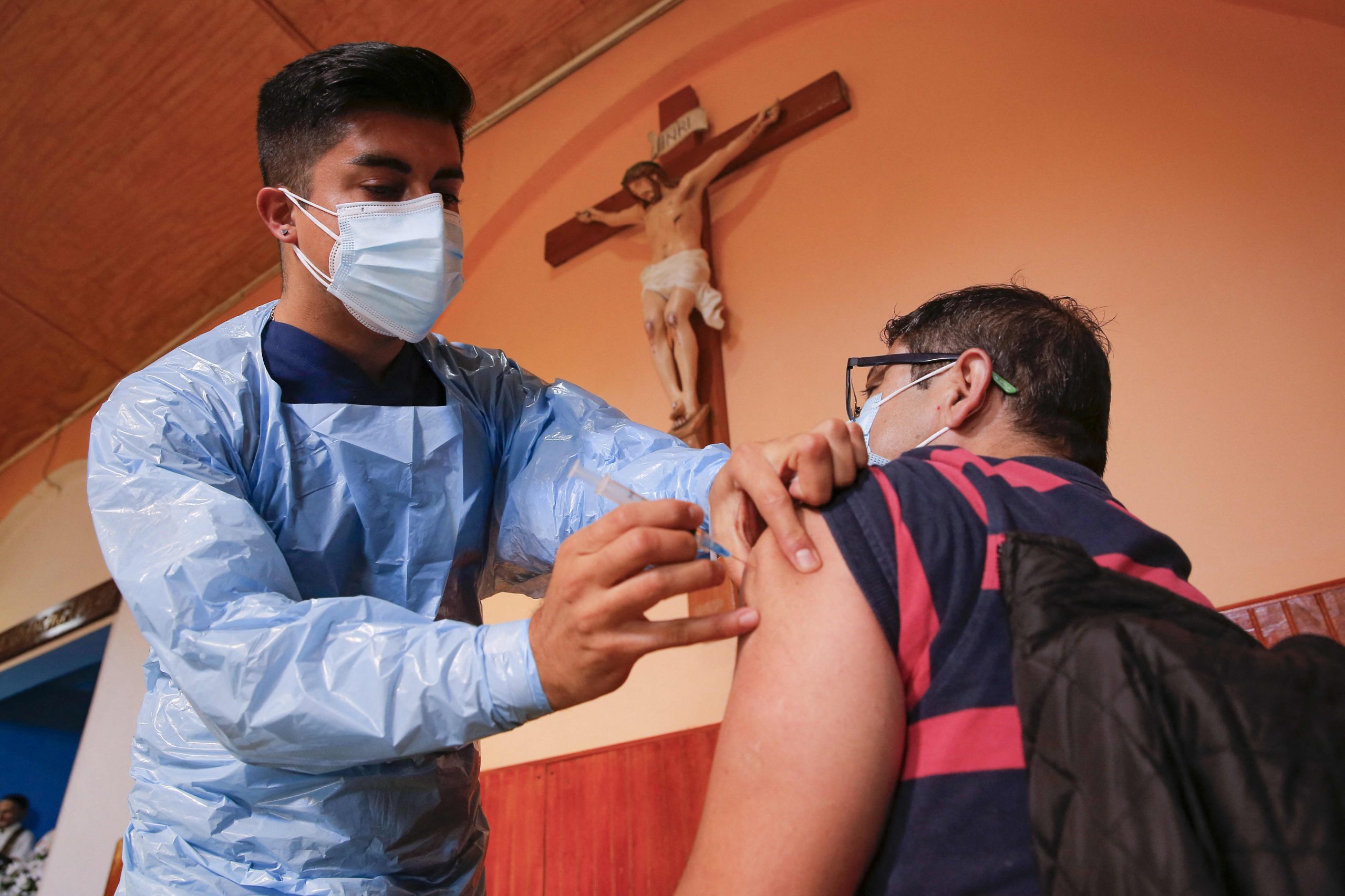 A health worker administers a dose of the Pfizer BioNTech vaccine against Covid-19 to a man at Medalla Milagrosa Church in Valparaiso, Chile, on April 6, 2021.