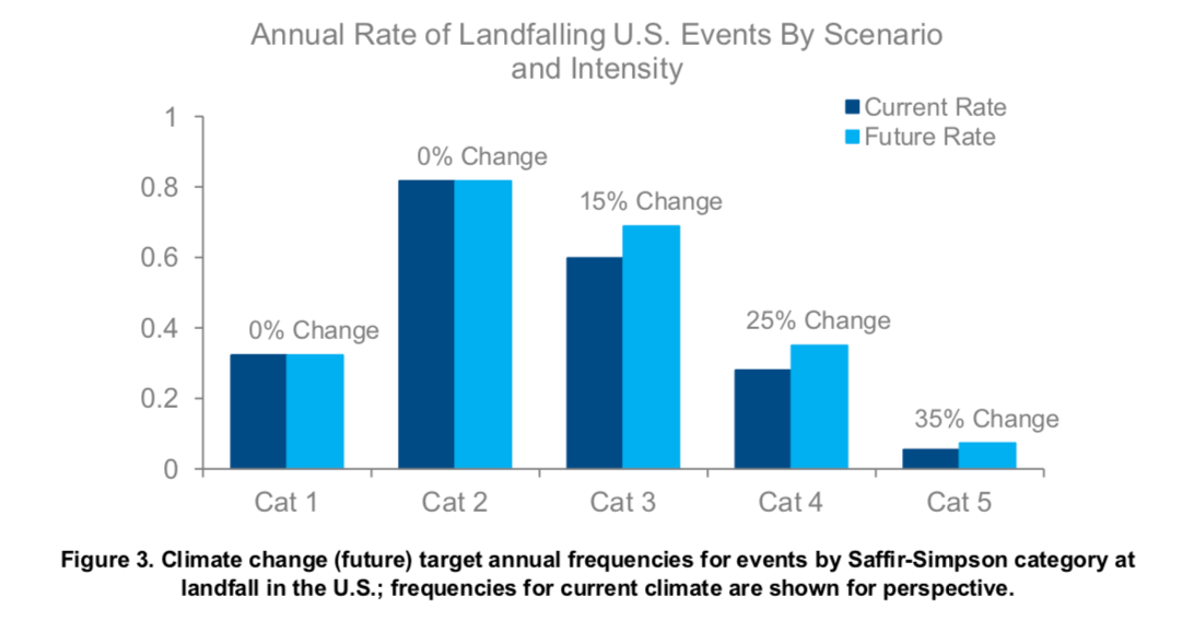“The results of the analysis show that increased event frequency and sea level rise will have a meaningful impact on future damage. The growth in the number of stronger storms, and landfalling storms overall, increases modeled losses by approximately 20%, with slightly larger changes in areas such as the Gulf and Southeast coasts where major landfalls are already more likely today. The loss increases extend to inland areas as well, as stronger storms may penetrate farther from the coast.