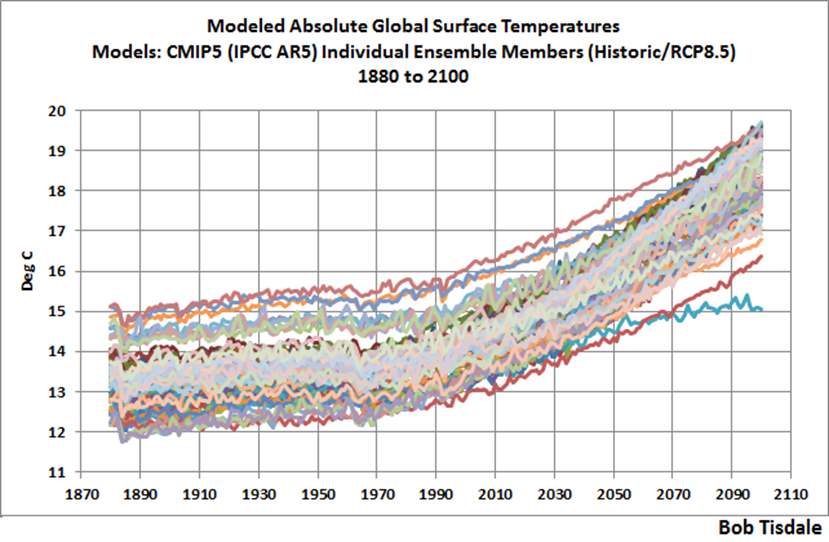 - Models hold back the anomalies sufficiently to match the observations. In fact, this is half true as the required model parameters are matched to true. The delusion lies in the use of model anomalies. In reality, the CMIP5 models varied in absolute temperatures by ~ 4 ° C in 2000 (at the beginning of their voting period) from roughly the observed global average of ~ 15.5 ° C.