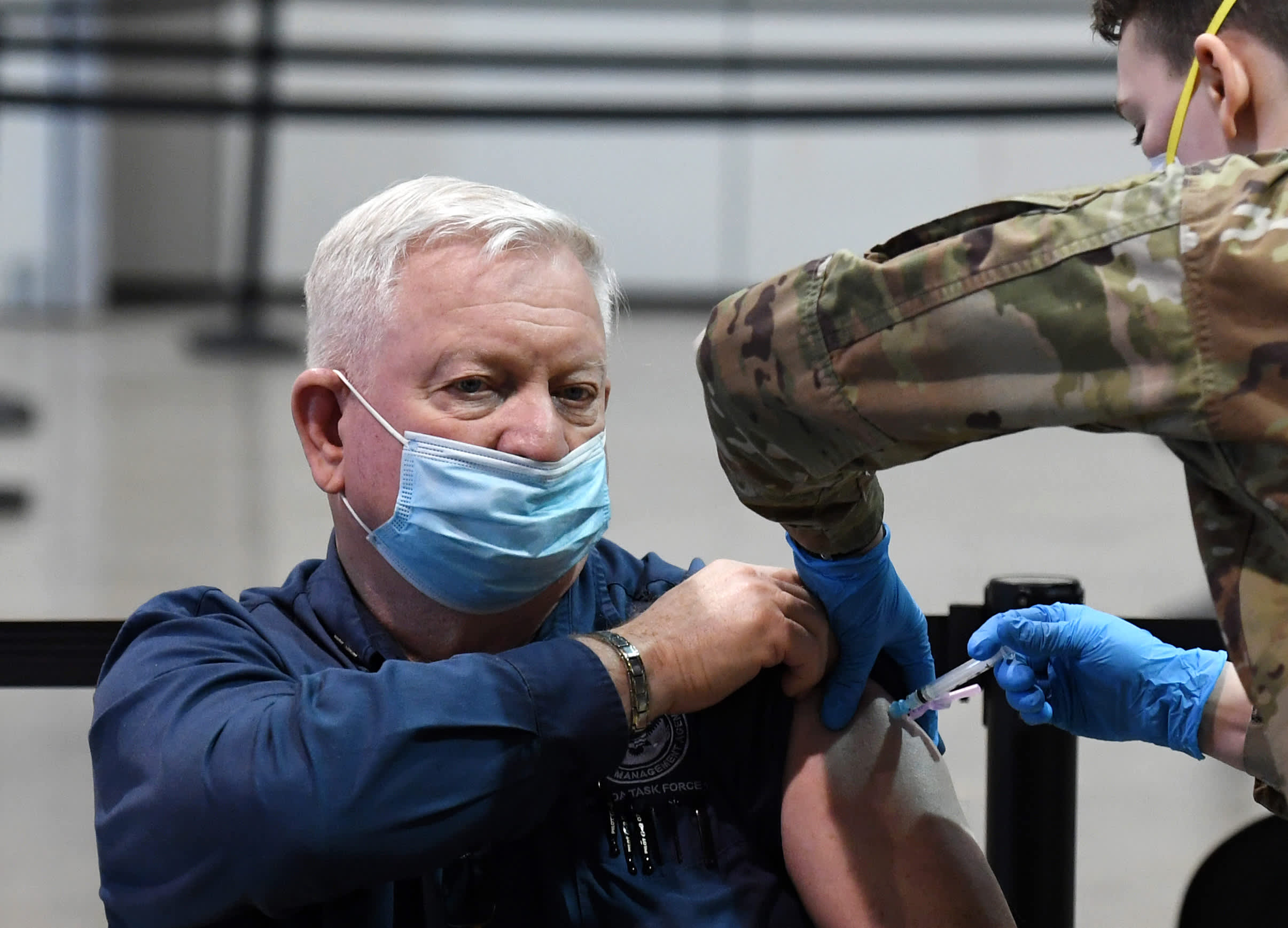 Spc. Katherine Deskins of the Nevada Army National Guard administered a COVID-19 shot of Moderna to Dennis West, director of human resources for the Federal Emergency Management Agency, on the first day of the Clark County’s pilot vaccination program at the Cashman Center on January 14, 2021 in Las Vegas. Nevada.