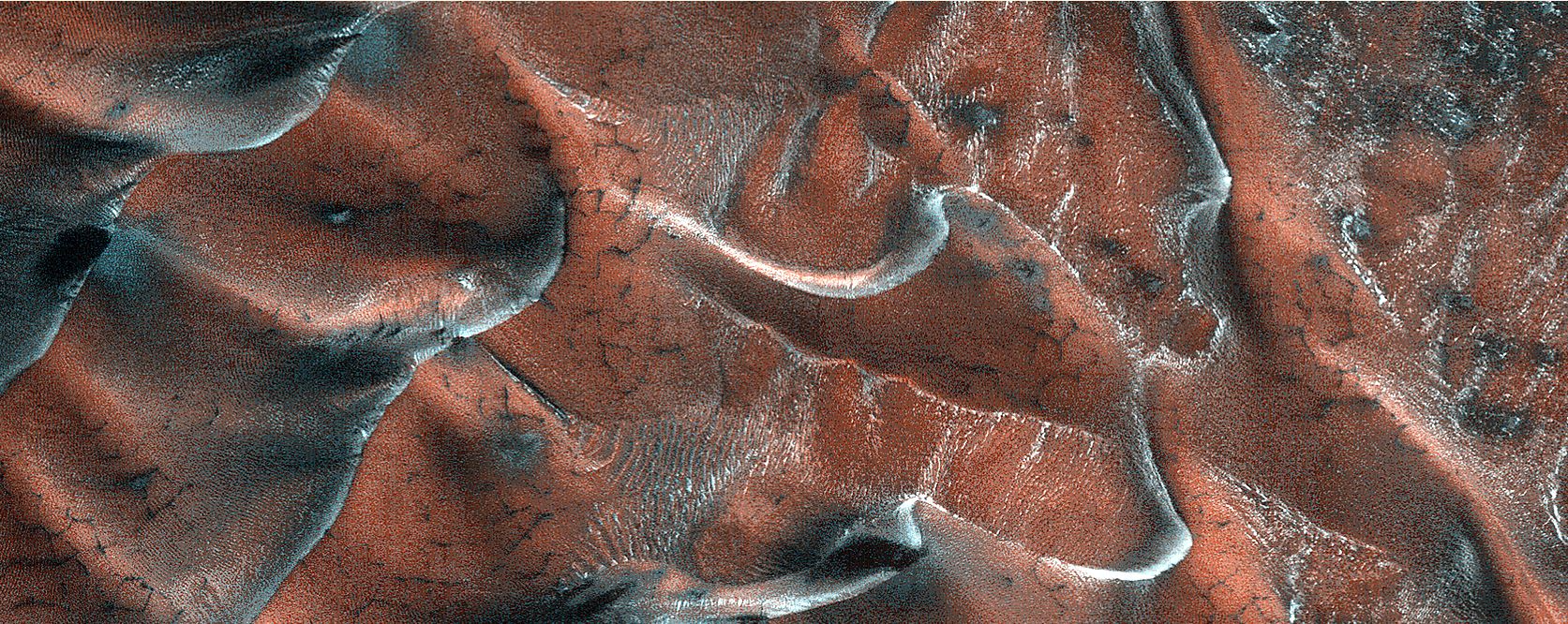 This new image from the High Resolution Imaging Science Experiment (HiRISE) camera of the Mars Reconnaissance Orbiter shows seasonal frost that has formed in a crater on a dune field. In autumn and winter, temperatures drop to a point where CO2 ice forms and deposits build up on the sides of the dunes.