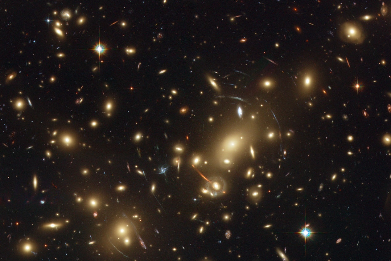 Image of Abell 2218, a dense galaxy cluster about 2 billion light-years from Earth.