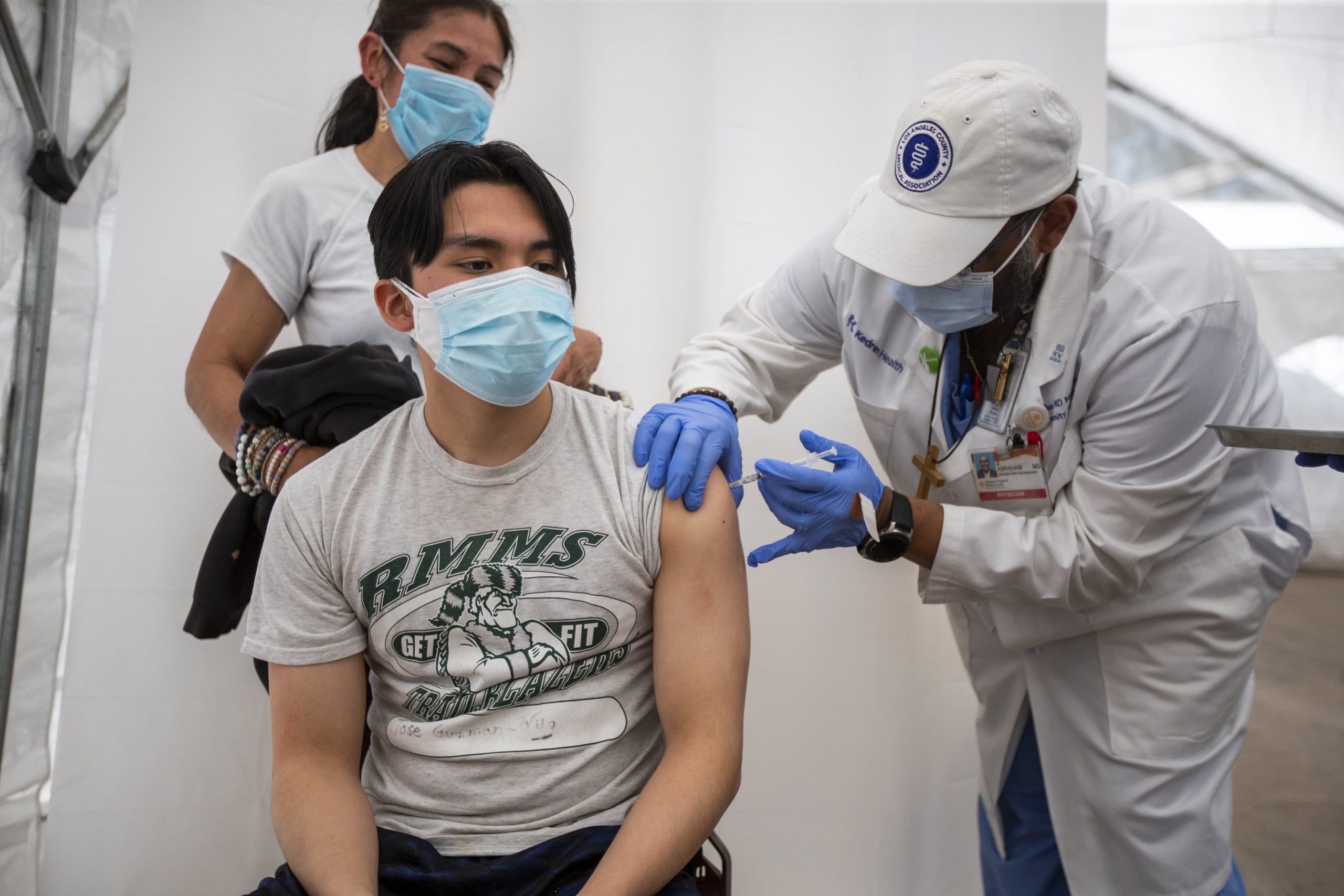 Dr. Jerry Abraham, director of Kedren Vaccines, right, gives Jose Guzman-Wug, 16, a COVID-19 shot while his mother, Adriana Wug, watches at Kedren Health in Los Angeles, CA on Thursday, April 15, 2021.