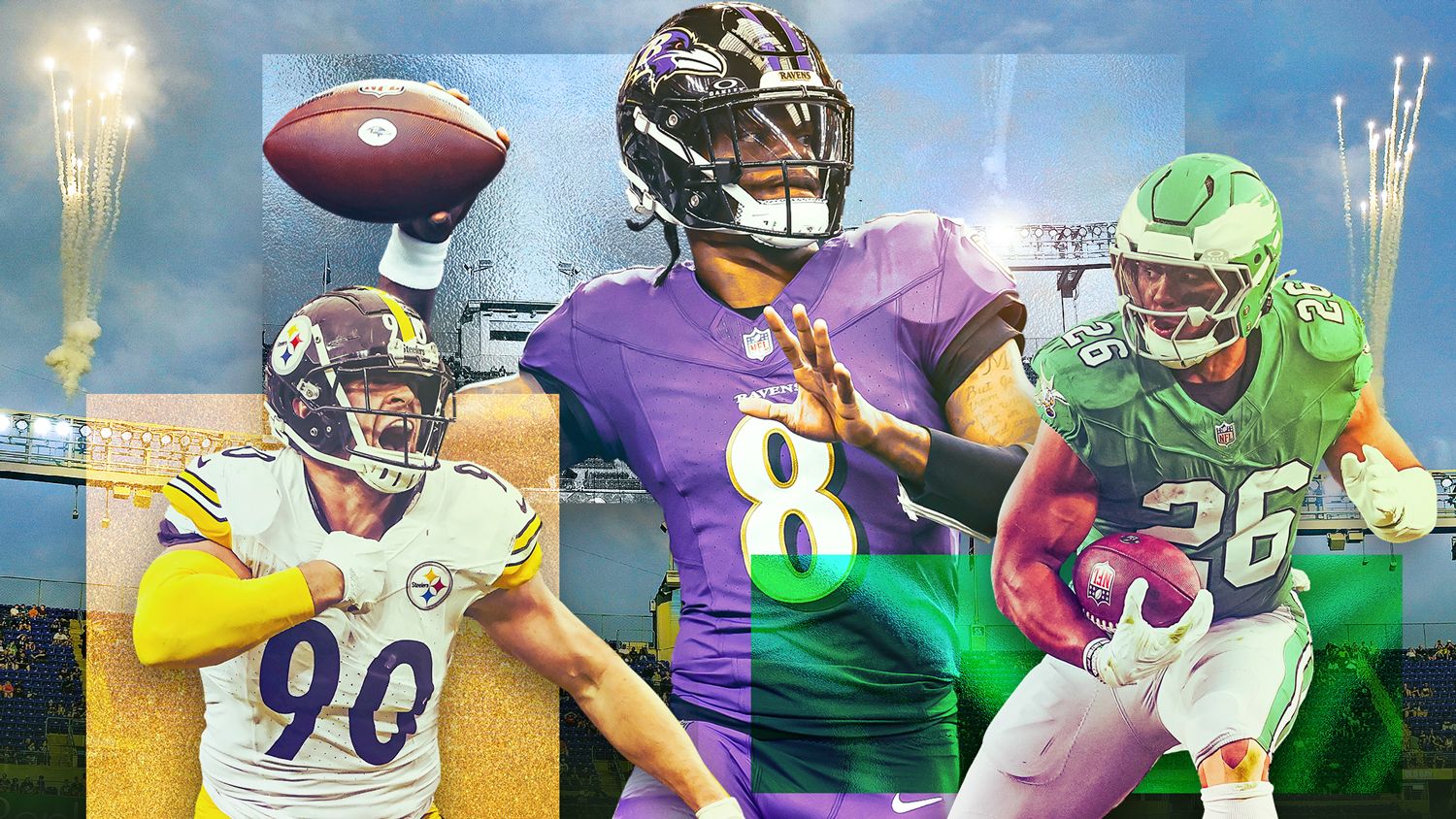 T.J. Watt (Steelers), Lamar Jackson (Ravens) and Saquon Barkley (Eagles) Illustration by ESPN