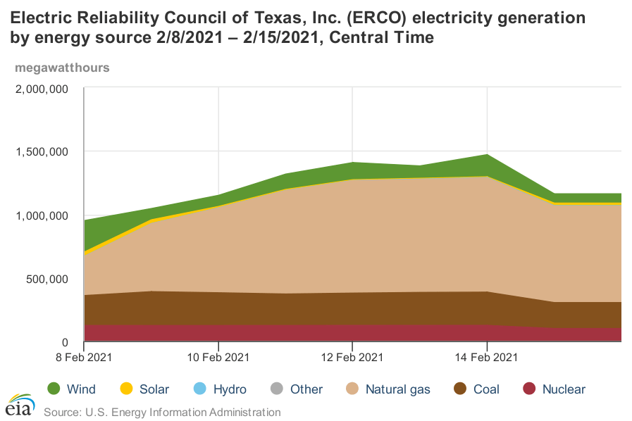 Eventually, about a third of the expected capacity went offline. This included a handful of freezing wind turbines, but most of the volume loss was due to coal and natural gas plants going offline.