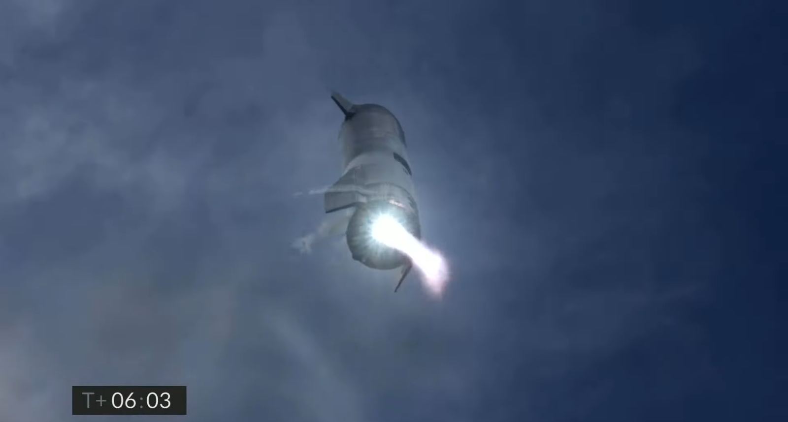 The flight began at 5:24:10 p.m. CDT (6:24:10 p.m. EDT; 3:24:10 p.m. PDT) under foggy conditions, similar to the SN11 flight a few weeks ago. As in all previous cases, the spaceship reached its climax, switched off its three Raptor engines (one at a time) and then reoriented itself for its descent (the “belly flop” maneuver). This time, however, the spaceship had no problems as it restarted two of its Raptor engines and drove the last few meters down.