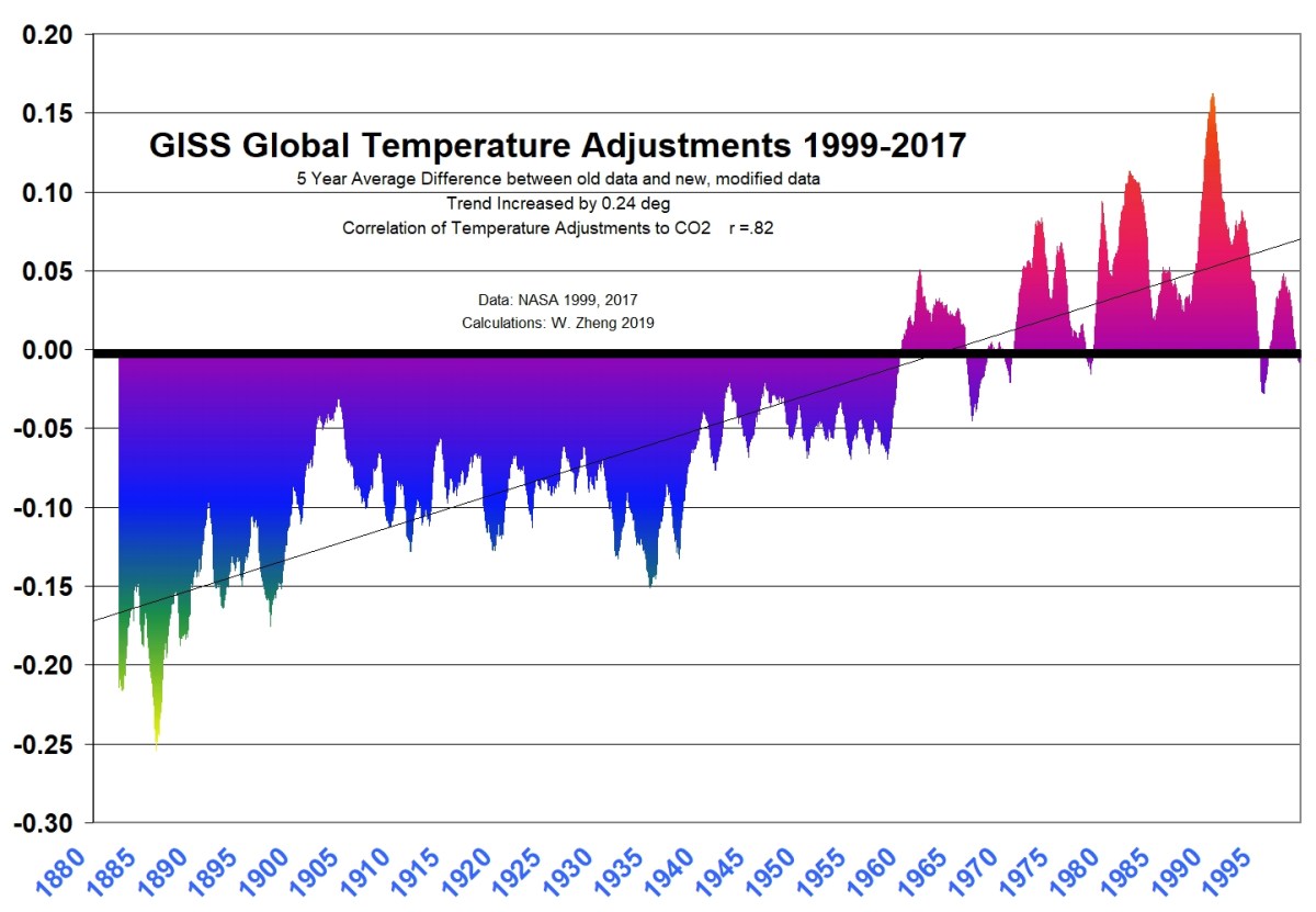What Wei Zhang illustrated is a near perfect correlation between adjustments to the surface temperature record by NASA GISS (and Gavin Schmidt) and the concentration of CO2 in the atmosphere. They artificially cooled the past before 1960 (around the time Mauna Loa’s CO2 measurements began) and artificially heated it in 1960 to this day.