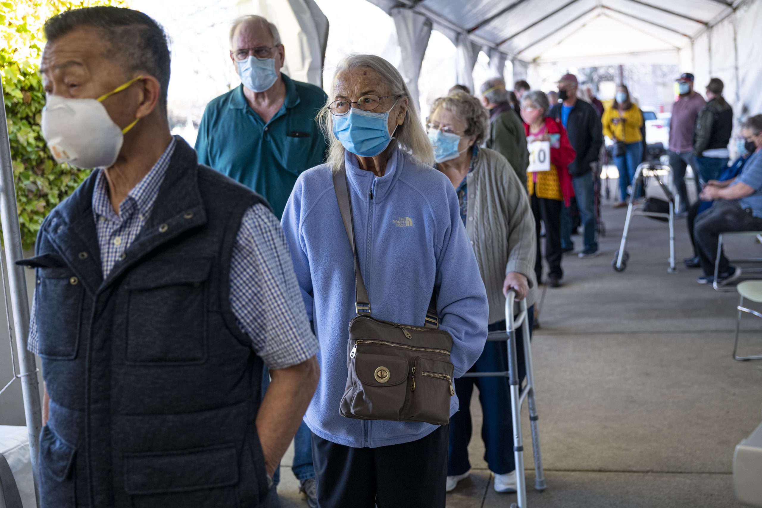 People wearing protective masks wait in line to receive a dose of the Pfizer-BioNTech Covid-19 vaccine at a major vaccination site in Sacramento, California on Thursday, February 4, 2021.