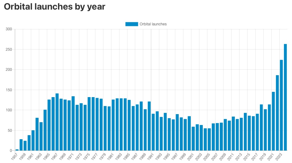 Launching a rocket into orbit should never become routine. There was a time, probably in the '50s and '60s, when a rocket launch made headlines. Now it's just another launch. Last year (2024) there were a record-breaking 263 launches. The US launched 158, China launched 68 and other countries/regions such as Europe, Russia and Japan. Last year only 224 launches were completed and two years ago, in 2022, there were 168 launches. Surprisingly, the future of rocket flight seems to be quite lively as the record was set back in 1967 at 141!